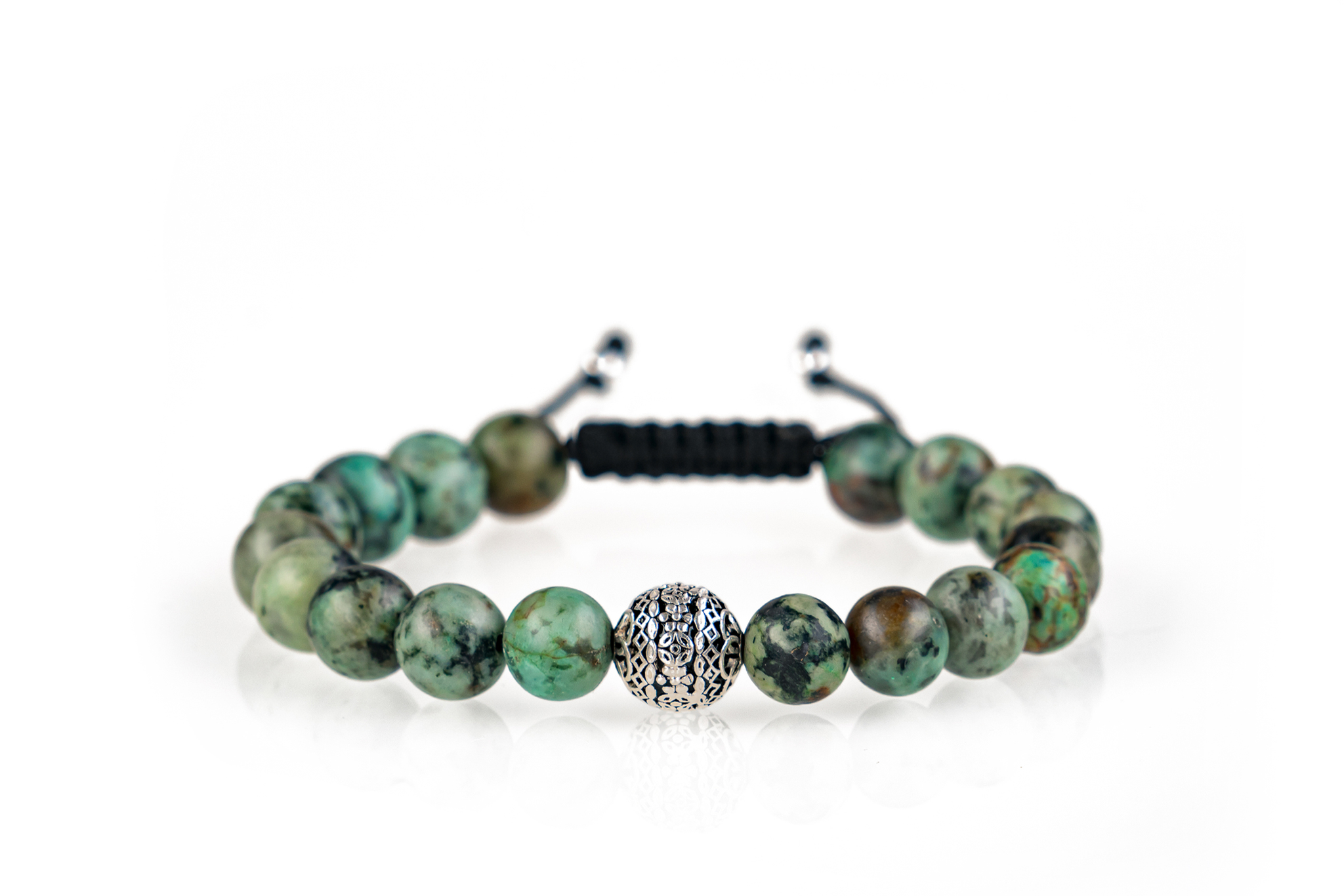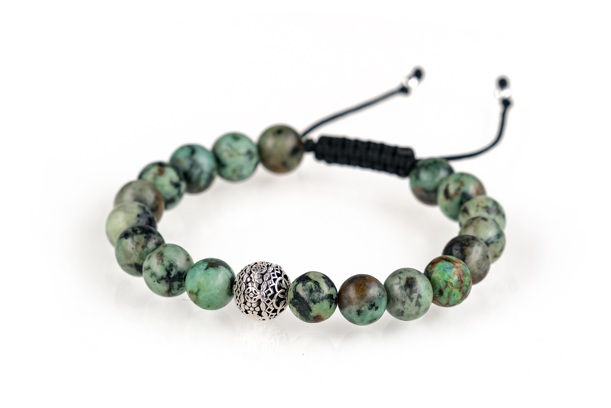 Modelul prezentat este finalizat cu un sitem de prindere reglabil, ce poate permite purtarea brățărilor pe încheieturi cu diametrul de minim 15 cm si maxim 21 cm. Acest sistem nu doar că oferă posibilitatea reglării diametrului, ci oferă și un grad de rezistentă sporit față de modelelel de brățări din pietre semi prețioase însirate pe suport elastic. Durata de viață a șnurului este de până la 50 ori mai mare decăt cea a suportului elastic folosit la brățările de acest gen.